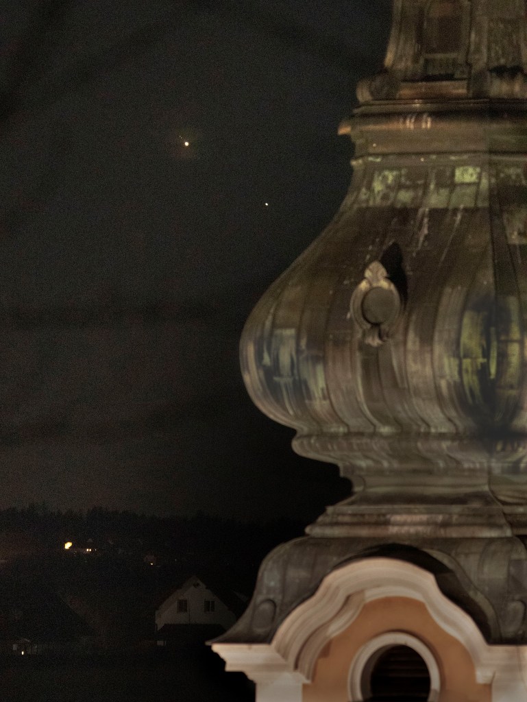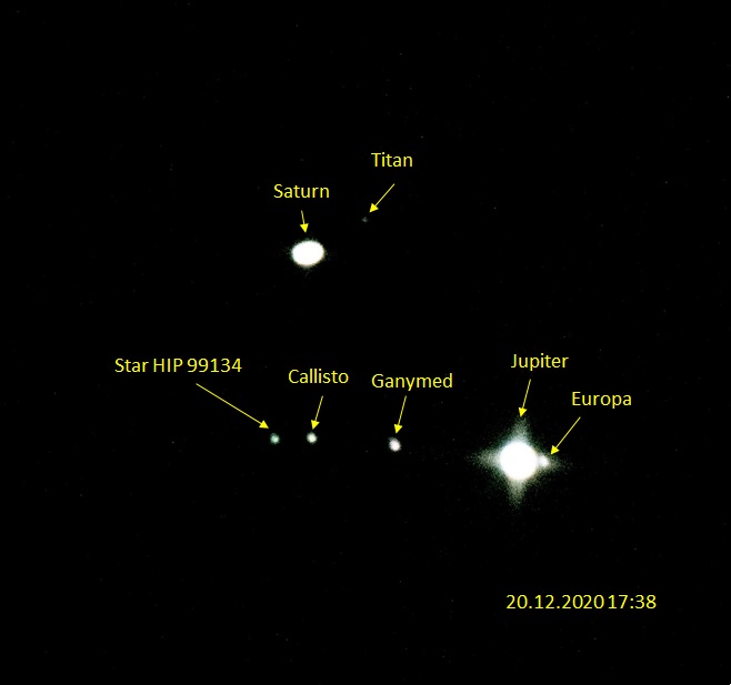 Die heurige Annäherung am 21.12.2020 war mit 6,1′ (entspricht 1/5 des scheinbaren Durchmessers Mond) ähnlich spektakuär und duch den weiteren Abstand zur Sonne (31°, also mehr als 2 h Positionsbewegung) doch besser zu beobachten. Hier folgen einige Aufnahmen von Peter Zeller und Kurt Niel, zwei glückliche Menschen, die auch mit freiem Auge die aktuelle Anäherung sahen. Dazu mussten sie vor Weihnachten in die angrenzente Steiermark ausweichen, weil OÖ durch die wochenlange Nebelsuppe beobachtungsgemäß im Nachteil lag. Danach war es auch in OÖ etwas besser zu sehen.